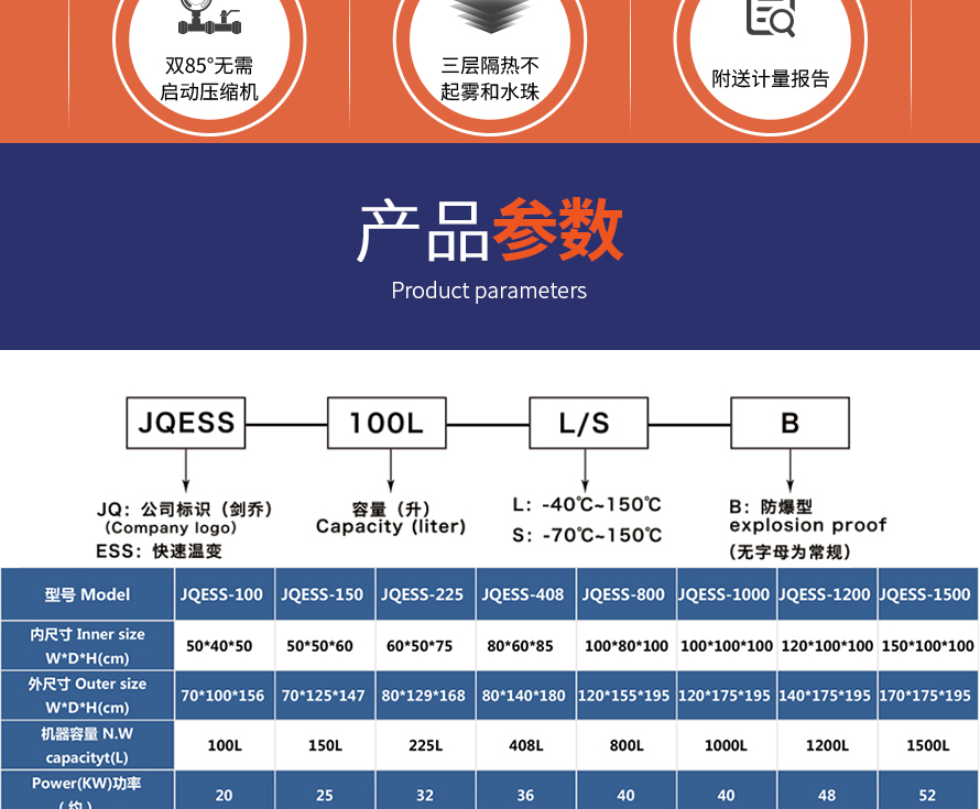 產品型號:JQESS-100L 品牌:劍 喬 用途:快速溫變試驗箱應用于,試驗各種產品及材料耐熱,耐寒,耐高溫,耐濕性能。適合電子,光伏組件,電器,食品,車輛,金屬,化學,建材等工廠,科研單位,院校之用。